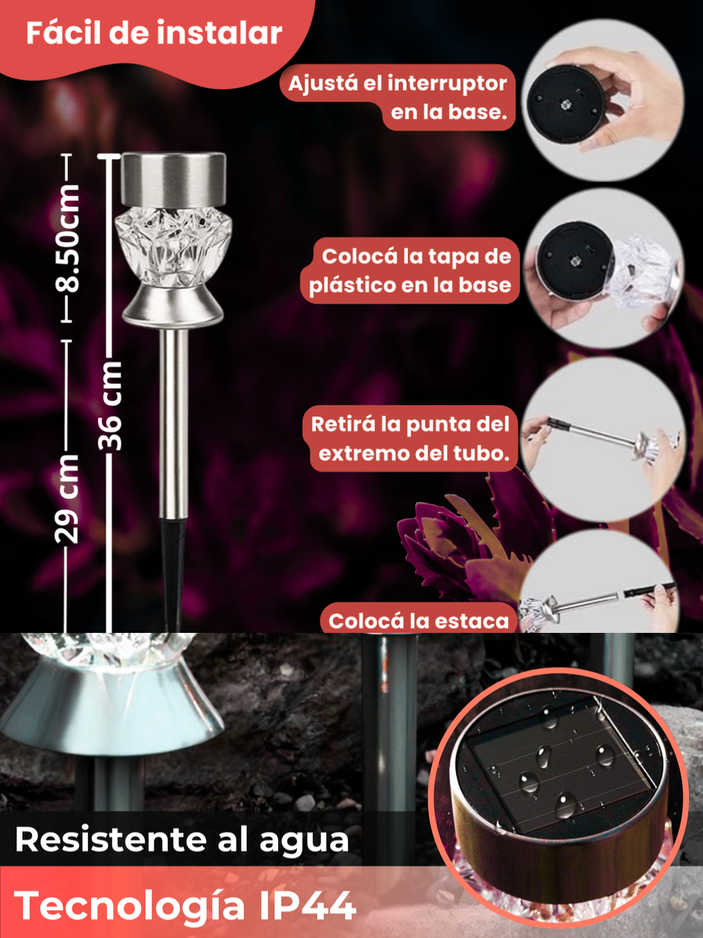 - Fácil instalación y mantenimiento: Solo clávalo en el suelo y disfruta, sin cables ni complicaciones.